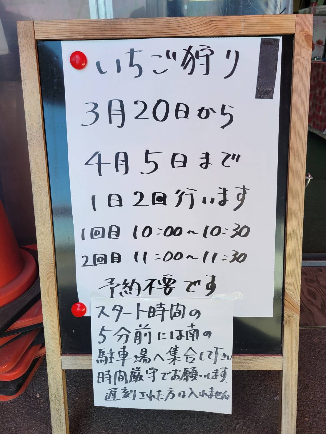 ⚠️キャンセルの場合はお電話にて、イチゴ狩り当日の開始時間1時間前までにお願い致します。万が一電話が混み合っていたり、繋がらない場合はメールでも構いませんので、当日スタート時間の1時間前までにはご連絡をお願い致します。タイトルを「イチゴ狩りキャンセルの件」とつけてお願い致します。1時間以内は通常料金が発生致します。※団体以上ご予約の場合は電話にてご連絡をお願い致します。 ※練乳の提供は行っておりません。 また持込につきましてもご遠慮願います。